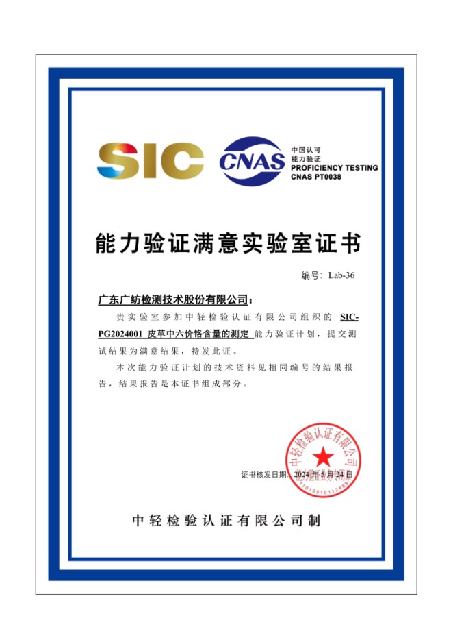 廣紡檢測公司取得皮革中六價鉻含量的測定(能力驗證)結(jié)果滿意證書 廣紡檢測收到中輕檢驗認(rèn)證有限公司發(fā)來的SIC-PG2024001皮革中六價鉻含量的測定能力驗證計劃滿意結(jié)果通知單和實驗室證書。六價鉻含量是衡量皮革及其制品安全衛(wèi)生性能的重要指標(biāo)之一,是皮革和鞋類等相關(guān)實驗室常規(guī)的檢驗項目。(廣紡檢測 蔡澤慧)